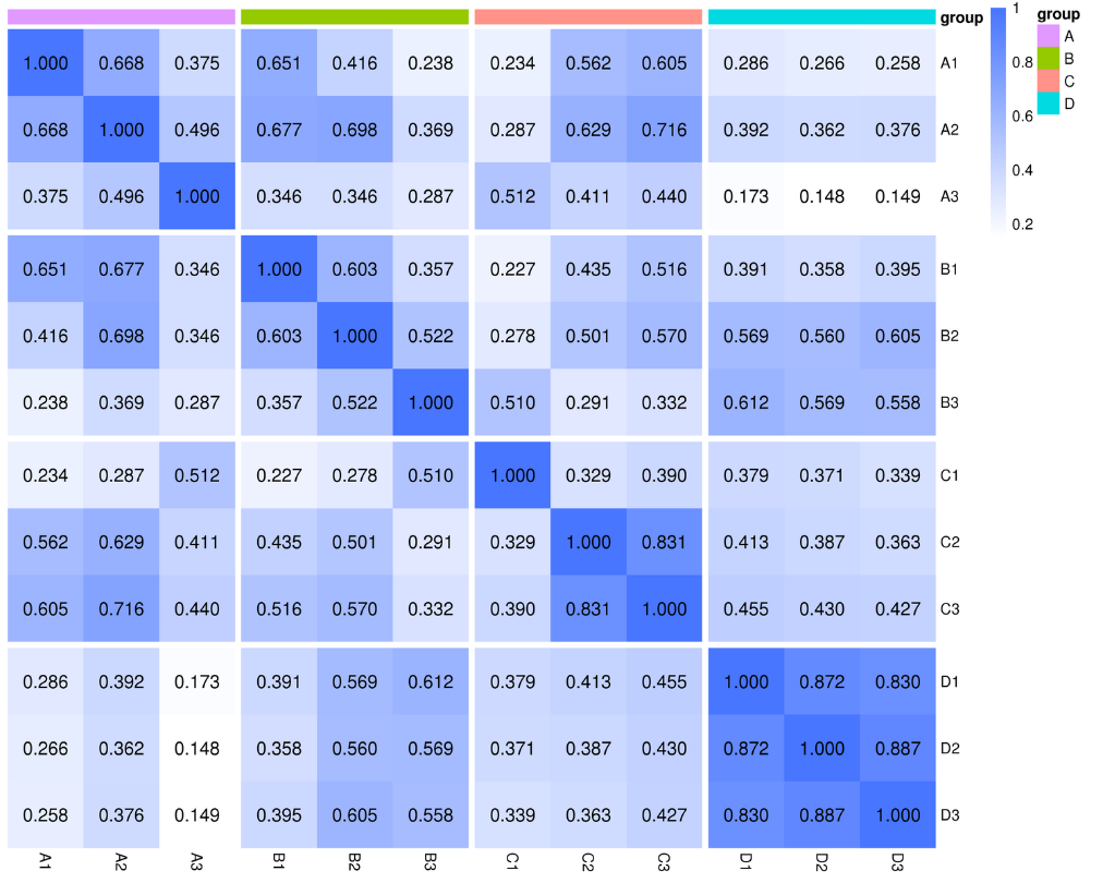 樣本相關性更改配色,并將組間隔開,更加直觀看出組內重復性。