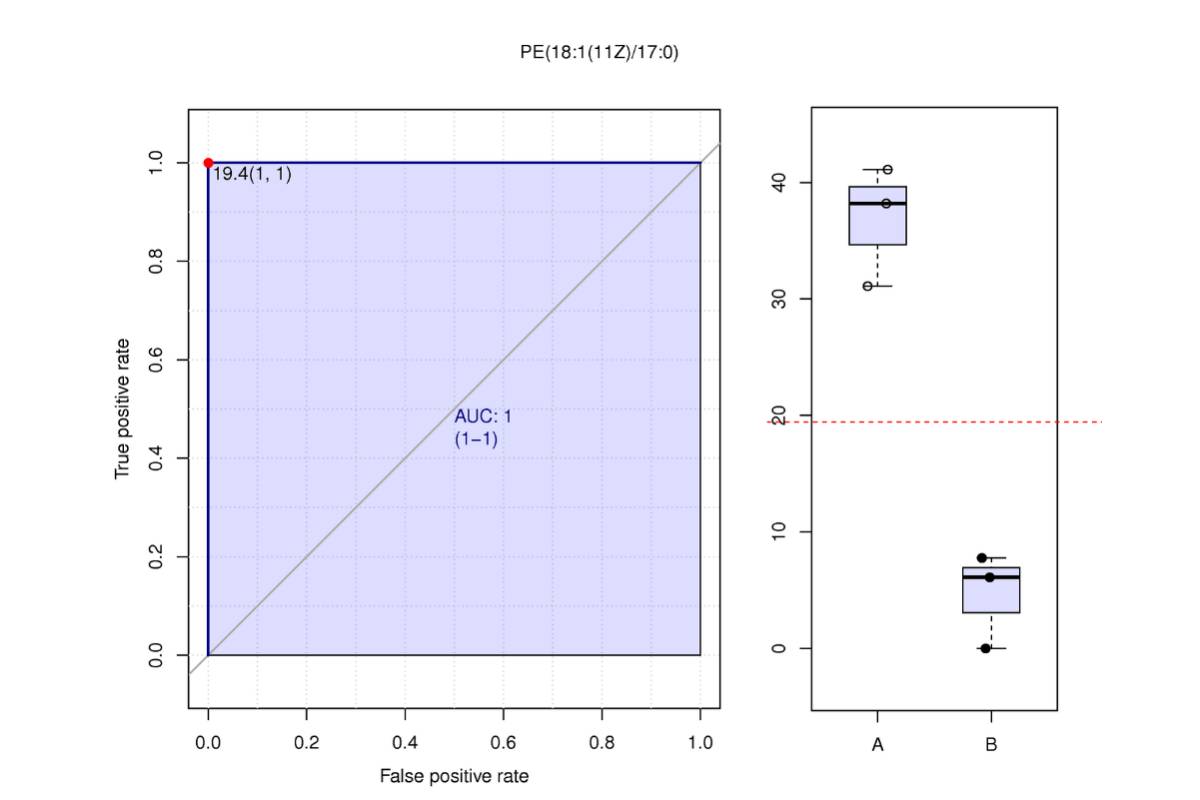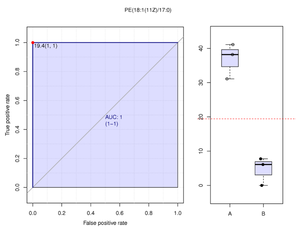ROC曲線 (receiver operating characteristic curve) 是一種常用來篩選評估生物標記物的分析方法[9]。AUC (Area under the curve) 是衡量ROC曲線非常有用的度量。AUC始終在0.5(兩個類在統(tǒng)計上相同)和1.0(有一個閾值可以實現(xiàn)類之間的完美分離)之間,越接近1,物質的在對照組和實驗組的分離就越明顯(即為潛在的生物標記物)。一般來說,組內生物學重復>15時,ROC曲線才有足夠的點繪制折線,才會體現(xiàn)出較大意義。對篩選出的各組差異代謝物單獨進行ROC分析。