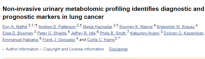 [1] Mathé EA, Patterson AD, Haznadar M, et al. Noninvasive urinary metabolomic profiling identifies diagnostic and prognostic markers in lung cancer. Cancer Res. 2014;74(12):3259-3270. doi:10.1158/0008-5472.CAN-14-0109.