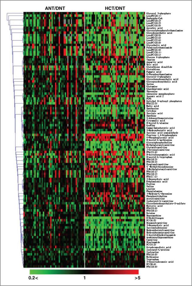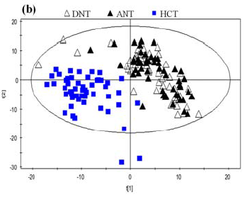 利用非靶向代謝組學技術(shù)對50例肝癌患者的癌組織(HCT)與近端癌旁組織(ANT)以及遠端癌旁組織(DNT)組織樣本中的代謝物進行LC-MS檢測分析,通過多元變量統(tǒng)計分析發(fā)現(xiàn)癌組織與近端以及遠端癌旁組織樣本之間區(qū)分明顯(圖1),即癌組織與近端以及遠端癌旁組織的代謝表型差異顯著。