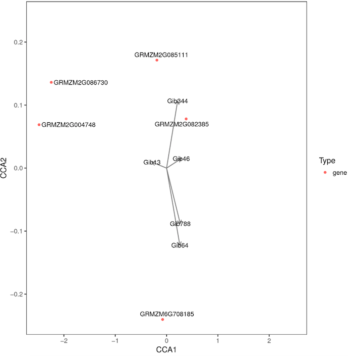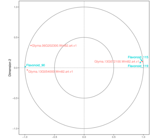 典型相關(guān)分析(canonical correlation analysis, CCA),是利用綜合變量對(duì)之間的相關(guān)關(guān)系來(lái)反映兩組指標(biāo)之間的整體相關(guān)性的多元統(tǒng)計(jì)分析方法。對(duì)相關(guān)性網(wǎng)絡(luò)圖中的差異基因及差異代謝物進(jìn)行典型相關(guān)分析,圖中以十字區(qū)分出四個(gè)區(qū)域,在同一個(gè)區(qū)域內(nèi),距原點(diǎn)越遠(yuǎn)關(guān)聯(lián)性越高,在同一個(gè)象限內(nèi)距離較近的代謝物和基因之間相關(guān)聯(lián)的程度高,基于此結(jié)果可進(jìn)一步挖掘和代謝物最相關(guān)的基因。