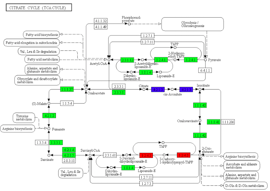 差異代謝物分析結(jié)果結(jié)合轉(zhuǎn)錄組差異基因分析結(jié)果,將相同分組的差異基因及差異代謝物同時(shí)映射到KEGG通路圖上,用綠色和紅色標(biāo)注基因或代謝物表達(dá)量顯著下調(diào)或上調(diào)的節(jié)點(diǎn),藍(lán)色標(biāo)注既有上調(diào)又有下調(diào)的基因,更好的了解基因與代謝物之間的關(guān)系。