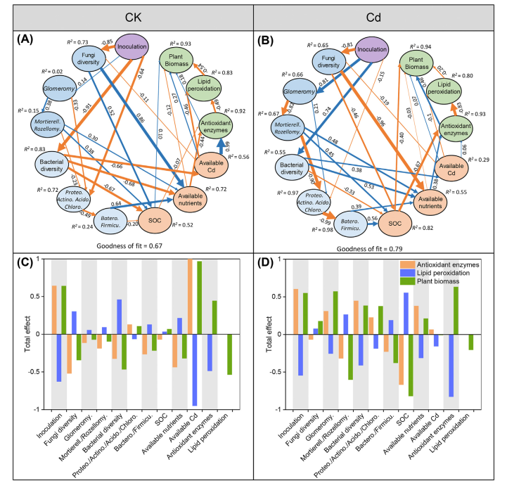 圖5 處理(接種和添加Cd)與微生物群落、土壤特性和植物抗性的級(jí)聯(lián)關(guān)系。偏最小二乘路徑模型(PLS-PM)剖析了處理、微生物群落和土壤特性對(duì)植物抗性的主要影響途徑(A)(B);以及每個(gè)變量對(duì)植物生物量、抗氧化酶和脂質(zhì)過(guò)氧化物的總影響(C)(D)。