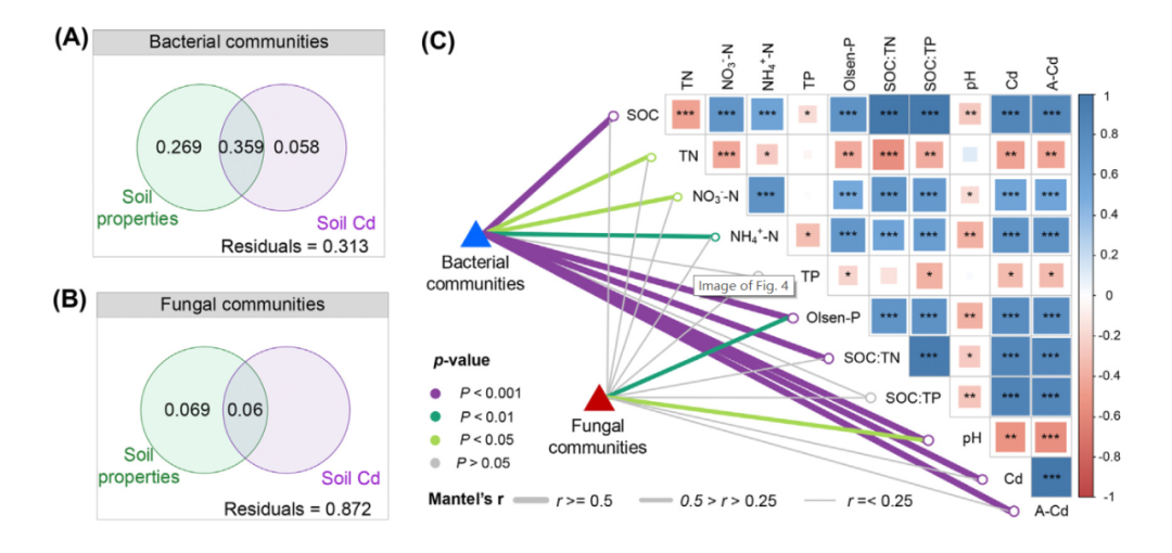 Pearson相關(guān)分析發(fā)現(xiàn),Cd、OTU和細(xì)菌群落的α多樣性指數(shù)(即Shannon、Simpson、Chao1和ACE)之間存在顯著的相關(guān)性(P<0.05)。除Shannon指數(shù)外,SOC、TN、SOC:TN和SOC:TP與OUT以及細(xì)菌群落中的這些α多樣性指數(shù)之間存在顯著的相關(guān)性。但是,除了真菌群落的OTU和Shannon與SOC和SOC:TN外,真菌群落的α多樣性指數(shù)與這些土壤性質(zhì)之間沒(méi)有發(fā)現(xiàn)明顯的相關(guān)性。