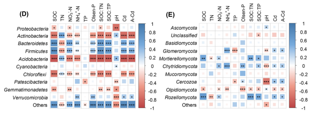 圖4 變異分區(qū)分析顯示了細(xì)菌(A)和真菌(B)群落解釋的土壤特性和土壤Cd的差異百分比。土壤變量與微生物群落結(jié)構(gòu)之間的關(guān)系(C)。細(xì)菌類群(門(mén)水平,D)和真菌類群(門(mén)水平,E)與土壤特性的相關(guān)熱圖。