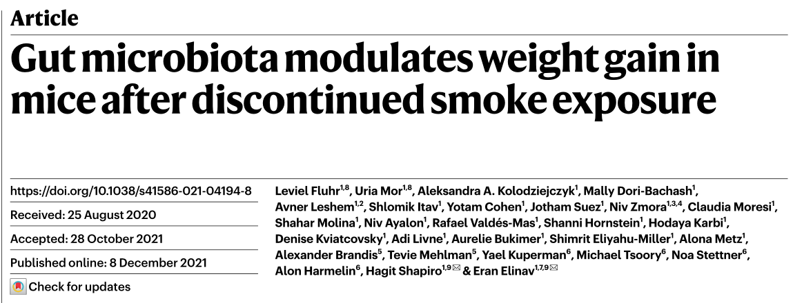 [1] Fluhr L, Mor U, Kolodziejczyk A A, et al. Gut microbiota modulates weight gain in mice after discontinued smoke exposure[J]. Nature, 2021, 600(7890): 713-719.