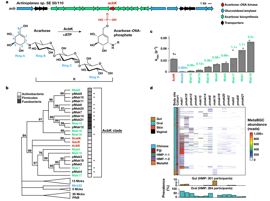 口服非抗生素藥物會無意中影響人體微生物組的組成。例如,阿卡波糖(一種用于治療2型糖尿病的天然衍生的α-葡萄糖苷酶抑制劑)對小鼠模型和人類的腸道微生物群具有深遠(yuǎn)的副作用。阿卡波糖是從土壤細(xì)菌放線菌中發(fā)現(xiàn)的,并由其工業(yè)化生產(chǎn)。人類微生物組編碼了大量的生化酶和生化途徑,其中大部分仍未確定。研究者使用基于宏基因組學(xué)的搜索策略,發(fā)現(xiàn)人類腸道和口腔微生物組的細(xì)菌成員編碼的酶選擇性地磷酸化臨床上使用的抗糖尿病藥物阿卡波糖,導(dǎo)致其失活。阿卡波糖是人類和細(xì)菌α-葡萄糖苷酶的抑制劑,限制了目標(biāo)生物代謝復(fù)雜碳水化合物的能力。利用生化分析、X射線結(jié)晶學(xué)和宏基因組學(xué)分析發(fā)現(xiàn),微生物來源的阿卡波糖激酶為其所在的生物體提供了對抗阿卡波糖活性的保護(hù)優(yōu)勢,并且廣泛存在于西方和非西方人群的微生物群中。這些結(jié)果提供了微生物群對非抗生素藥物的廣泛耐藥性的例子,并表明阿卡波糖耐藥性已經(jīng)在人類微生物群中傳播,作為一種防御策略對抗?jié)撛诘膬?nèi)源性密切相關(guān)分子的產(chǎn)生。