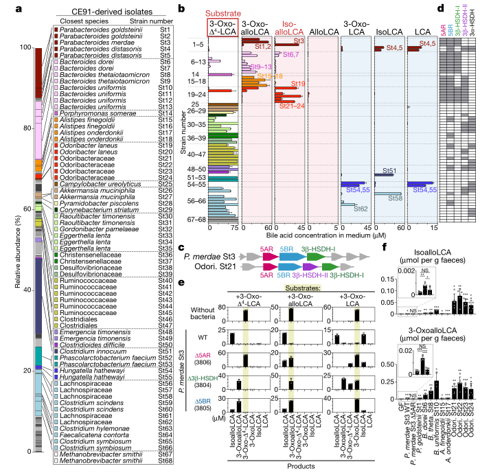 長期以來,微生物組一直被認(rèn)為是決定老年人健康狀況的關(guān)鍵因素,因?yàn)樗诳刂葡δ堋⒐敲芏?、神?jīng)活動、免疫力和對病原體感染的抵抗力方面發(fā)揮著作用。百歲老人對衰老相關(guān)疾病、慢性炎癥和傳染病的易感性降低。在該研究中,發(fā)現(xiàn)百歲老人有一個獨(dú)特的腸道微生物組,其中富含能夠產(chǎn)生獨(dú)特的次級膽汁酸的微生物,包括各種異構(gòu)體的石膽酸(LCA):3-oxo-,allo-,3-oxoallo-和isoallolithocholic acid。在這些膽汁酸中,isoalloLCA的生物合成途徑從未被報導(dǎo)過。從一名百歲老人糞便微生物群中篩選出了68株細(xì)菌,在體外和體內(nèi)都鑒定了Odoribacteraceae菌株是產(chǎn)生同種isoalloLCA的有效菌株。此外,還發(fā)現(xiàn)5-羥基類固醇脫氫酶(3-α-β-HSDH)和5-羥基類固醇脫氫酶(5-β-reductase,5AR)負(fù)責(zé)isoalloLCA的產(chǎn)生。IsoalloLCA對革蘭氏陽性多重耐藥病原菌,包括艱難梭狀芽胞桿菌和屎腸球菌有很強(qiáng)的抗菌活性。這些發(fā)現(xiàn)表明,特定膽汁酸的代謝可能與降低感染病原體的風(fēng)險有關(guān),從而可能有助于維持腸道內(nèi)環(huán)境的穩(wěn)定。