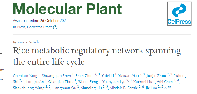 [2] Yang C, et al. Rice metabolic regulatory network spanning the entire life cycle. Mol Plant. 2021 Oct 26:S1674-2052(21)00411-1. doi: 10.1016/j.molp.2021.10.005. Epub ahead of print. PMID: 34715392.