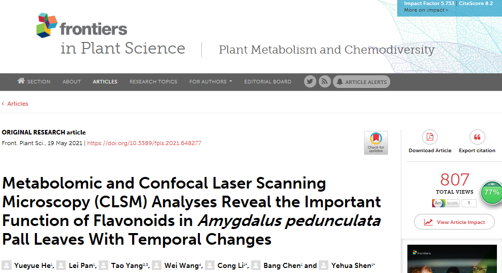 中文題目:代謝組學和激光共聚焦顯微鏡(CLSM)分析揭示長柄扁桃葉生長過程中黃酮類化合物的重要作用