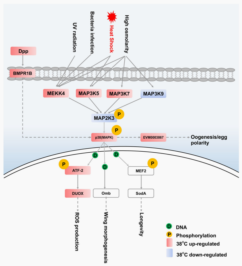 作者進一步結(jié)合不同逆境條件處理下的轉(zhuǎn)錄組數(shù)據(jù),分析推測出橘小實蠅中熱休克蛋白的相對穩(wěn)定高表達是其快速適應逆境的內(nèi)在機制。并發(fā)現(xiàn)在高溫條件下,p38 MAPK通路關鍵基因表現(xiàn)為應激性高表達,表明p38MAPK信號通路在橘小實蠅快速適應新環(huán)境的過程中發(fā)揮重要作用,并且可能是橘小實蠅在非生物脅迫下維持穩(wěn)態(tài)機制的核心。