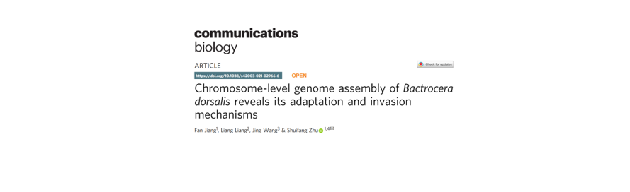 2022年1月11日,Nature子刊Communications Biology在線發(fā)表了中國檢科院首席科學家朱水芳科研團隊領銜完成的研究論文“Chromosome-level genome assembly of Bactrocera dorsalis reveals its adaptation and invasion mechanisms”。該研究報道了橘小實蠅染色體水平基因組,并從多個角度揭示了橘小實蠅在全球入侵過程中的環(huán)境適應性及其復合體種類豐富的分子機制,為橘小實蠅的入侵防控提供了新思路與新方法。百邁客有幸作為共同作者參與本項研究。