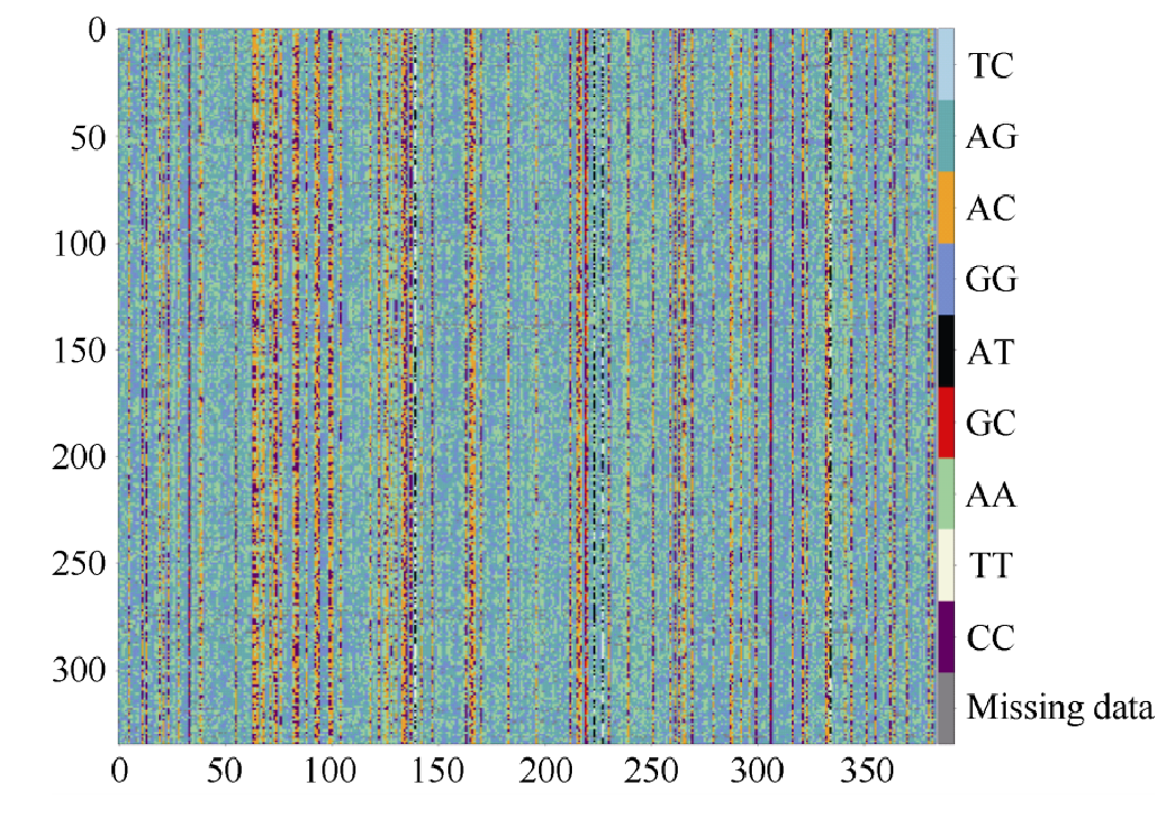 篩選適宜的核心標記位點,并將其用合適的形式展現(xiàn)出來至關重要。利用篩選得到的SNP標記進行品種材料的鑒定,并構建DNA指紋圖譜。例如,玉米DNA指紋圖譜構建研究中,利用384個?SNP?標記組合構建了?335?個玉米雜交種的基因型指紋圖譜,?該圖顯示每個品種的基因型組合均不同,?即?384?個?SNP?位點能夠有效區(qū)分所測試的雜交種。