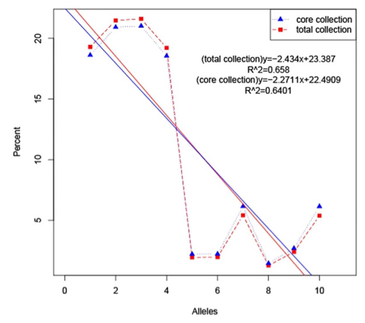 構(gòu)建好的核心種質(zhì)采用何種方法去評估核心樣品對整個種質(zhì)資源多樣性的代表性同樣是核心種質(zhì)研究中的重點。目前,大多數(shù)研究者結(jié)合不同的方法對核心種質(zhì)進行評估驗證,通過對原始種質(zhì)材料和篩選的核心種質(zhì)材料進行主成分分析,評估種質(zhì)篩選的準確性,原則上,基于核心種質(zhì)繪制的主成分圖和所有材料的分布圖趨勢吻合,就能說明篩選結(jié)果的合理性;計算常規(guī)的遺傳多樣性指標:觀測雜合度(Observed?heterozygosity)、期望雜合度(Expected?heterozygosity)、Nei遺傳多樣性(Nei?diversity?index)、香濃維納多樣性指數(shù)(Shanon-Wiener?index)、多態(tài)性信息含量(PIC),對原始種質(zhì)材料以及篩選的核心種質(zhì)的遺傳多樣性進行評價;另外還包括等位基因評價和表型評價。