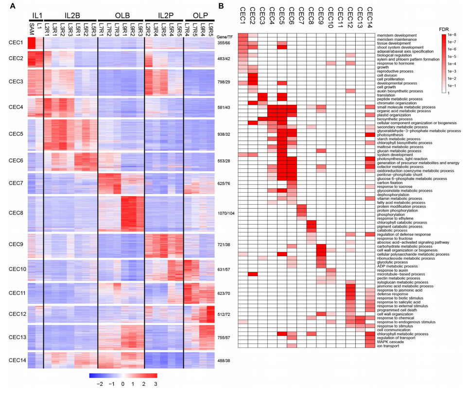 作者在全基因組水平上鑒定了不同葉片中的差異表達(dá)基因(DEG),以探索葉片之間的多樣性和潛在功能。通過分析,共發(fā)現(xiàn)9,133DEG,k-means聚類將差異基因分為14個(gè)共表達(dá)簇(CEC1-CEC14),這些CEC與圖1中的5個(gè)聚類簇緊密相關(guān)。IL1中DEGs的高表達(dá)水平以CEC1和2為代表。CEC1在SAM中高度表達(dá),并以與分生組織發(fā)育、組織發(fā)育和近軸/遠(yuǎn)軸極性相關(guān)的基因?yàn)榇怼EC2在SAM和L1高表達(dá),包含與細(xì)胞分裂、細(xì)胞增殖、細(xì)胞生長和生長素生物合成過程相關(guān)的基因。IL2B中DEG的高表達(dá)水平以CEC4-6為代表。CEC4、5和6均富集于有機(jī)酸代謝過程、淀粉代謝過程、質(zhì)體組織和硫苷代謝、光合光反應(yīng)等過程。IL2P中DEGs的高表達(dá)以CEC9為代表。CEC9富含植物細(xì)胞壁相關(guān)過程,包括壁組織或生物發(fā)生,以及果膠代謝過程。OLB中DEGs以CEC7和8為代表。CEC7在L7葉片中高表達(dá),并以與蛋白質(zhì)修飾過程、蛋白質(zhì)磷酸化和蛋白質(zhì)絲氨酸/蘇氨酸激酶活性相關(guān)的基因?yàn)榇?。這些結(jié)果反映L7具有明顯的信號轉(zhuǎn)導(dǎo)和基因調(diào)控特征。CEC8在L9葉片中高表達(dá),含有一組與葉綠素分解代謝過程、細(xì)胞分解代謝過程、防御反應(yīng)調(diào)節(jié)、果糖反應(yīng)和脫落酸激活信號通路相關(guān)的基因。OLP中DEG的高表達(dá)水平以CEC11和12為代表。CEC11中的基因在L7-L9的葉柄中高度表達(dá),在任何基因本體(GO)術(shù)語中均未富集。CEC12中的基因在L9的葉柄中高度表達(dá)。這些基因可能主要參與脫落酸激活的信號通路、茉莉酸(JA)代謝過程、JA反應(yīng)、防御反應(yīng)、生物刺激反應(yīng)、水楊酸反應(yīng)和外部刺激反應(yīng)。這些結(jié)果表明,L9可能在保護(hù)多葉頭部免受外部損害方面發(fā)揮作用。
