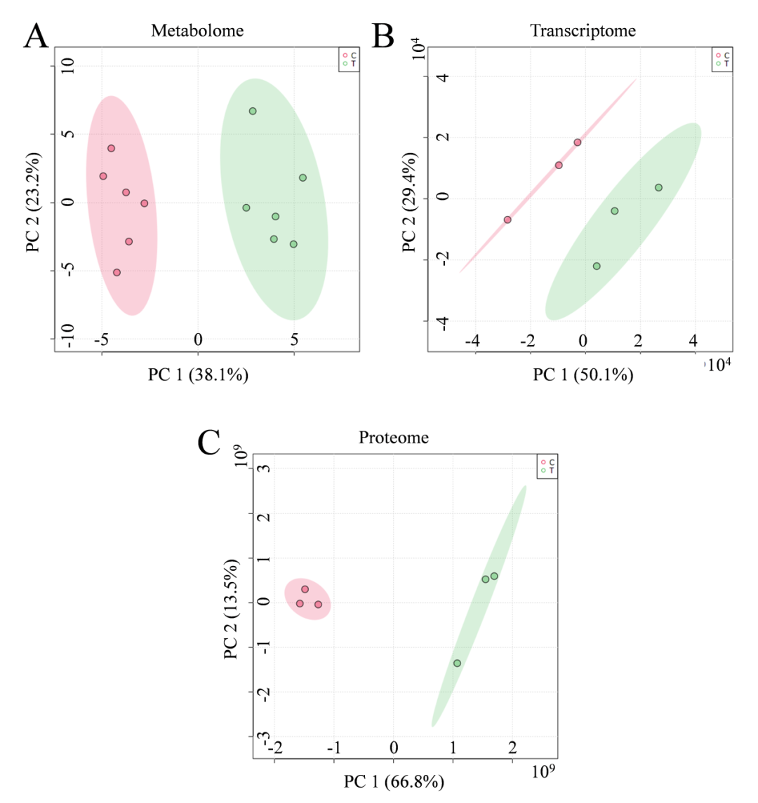 圖1?代謝組(a)、轉(zhuǎn)錄組(b)和蛋白質(zhì)組(c)的主成分分析