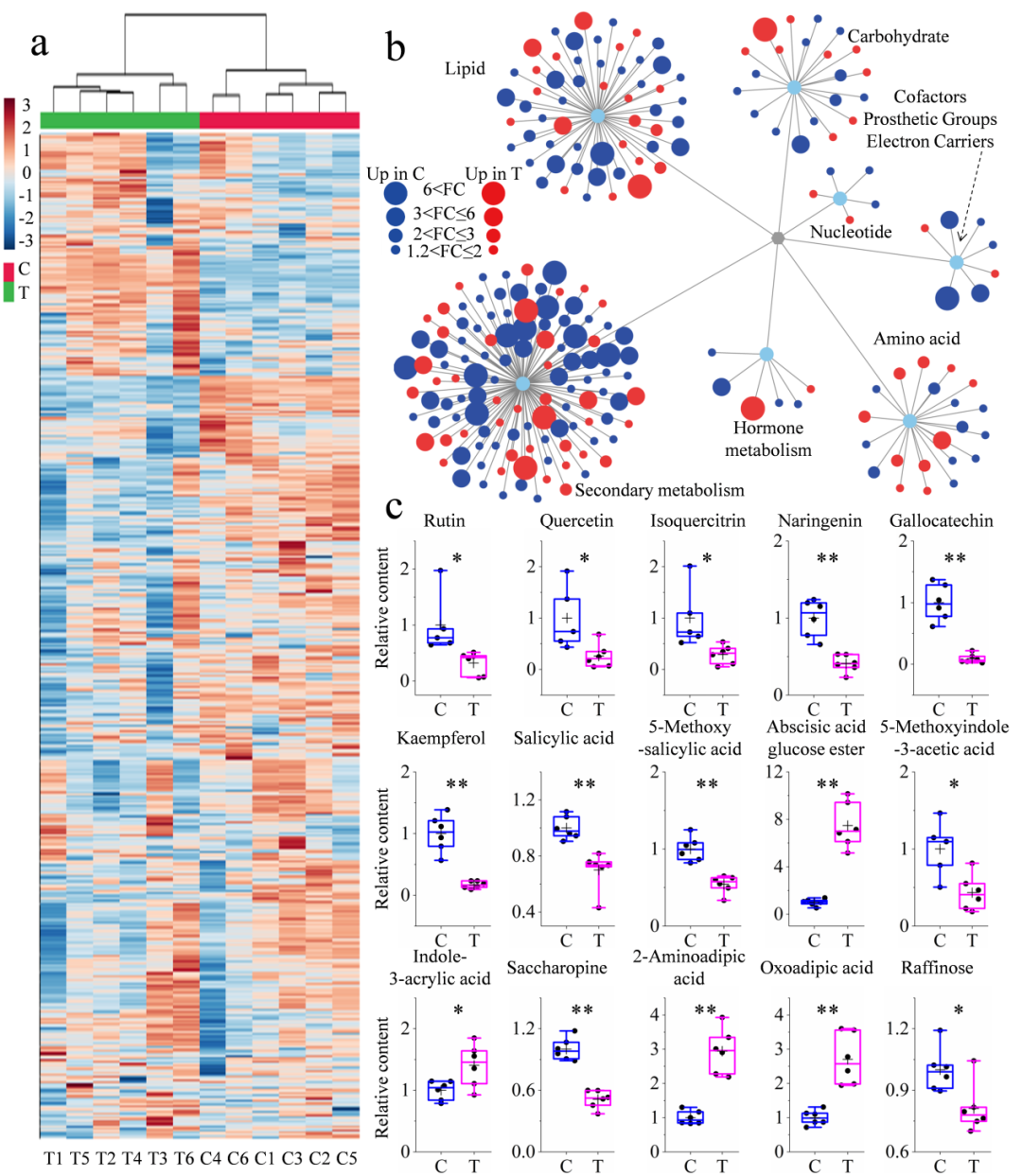 圖2四環(huán)素改變了代謝組,特別是次生代謝和脂質(zhì)代謝。a、代謝物的熱圖譜聚類,顯示代謝物的相對(duì)含量。b、差異代謝物根據(jù)其功能/通路的綜合性進(jìn)行聚類。?圓的大小與折疊變化(FC)值成正比。?紅色表示在四環(huán)素中有更高的FC?(T),而藍(lán)色表示在對(duì)照中有更高的FC?(C)。c、受四環(huán)素影響的代謝途徑相關(guān)代謝物的箱式圖。?*在P?<?0.05時(shí)差異顯著,**在P?<?0.01時(shí)差異顯著。