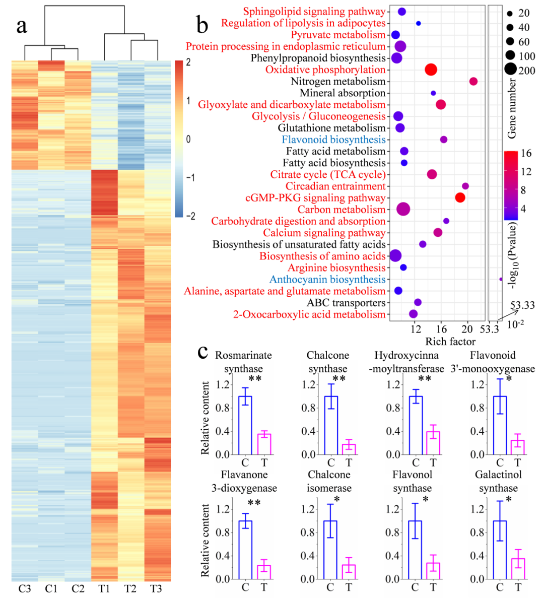 圖3?四環(huán)素改變轉(zhuǎn)錄組。a、差異轉(zhuǎn)錄本的熱圖聚類。b、差異轉(zhuǎn)錄本的KEGG。?圓越大,差異就越大。因子越高,富集程度越大。?紅色表示T中KEGG表達(dá)上調(diào),藍(lán)色表示T中KEGG表達(dá)下調(diào)(P?<?0.05,上調(diào)或下調(diào)80%以上)。c、受四環(huán)素影響的代謝途徑相關(guān)轉(zhuǎn)錄本的例子。