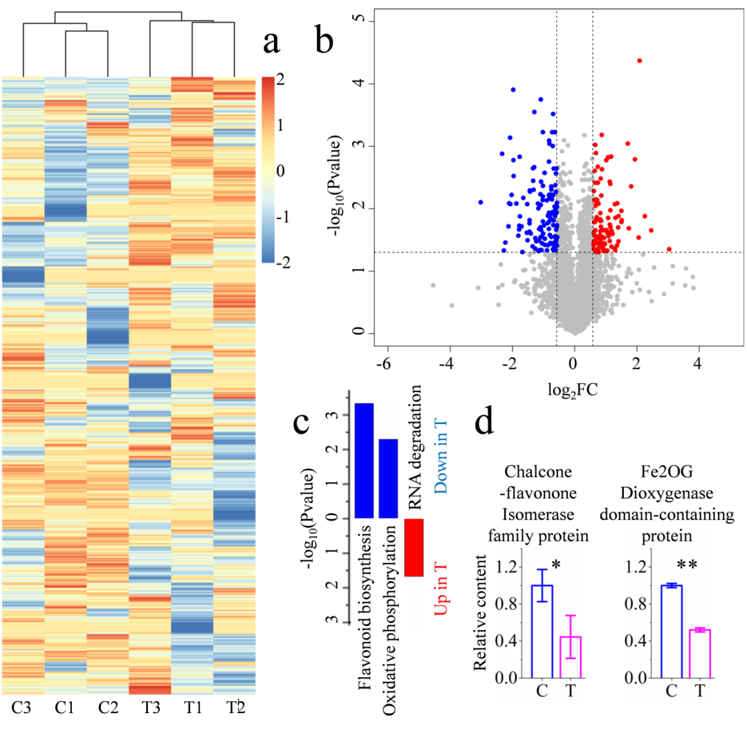 與對(duì)照組相比,在四環(huán)素處理下有273種蛋白質(zhì)發(fā)生了顯著變化(P<?0.05)。KEGG富集分析發(fā)現(xiàn),這些差異蛋白與類黃酮生物合成、氧化磷酸化、RNA降解、植物晝夜節(jié)律和α?-亞麻酸代謝相關(guān)。最顯著的是,在四環(huán)素脅迫下,與RNA降解相關(guān)的蛋白顯著增加(P?<?0.05,增加80%以上)。黃酮類化合物的生物合成和氧化磷酸化顯著減少(P?<?0.05,下降80%以上)。與轉(zhuǎn)錄組結(jié)果一致,黃酮類化合物的生物合成通路也是顯著降低。