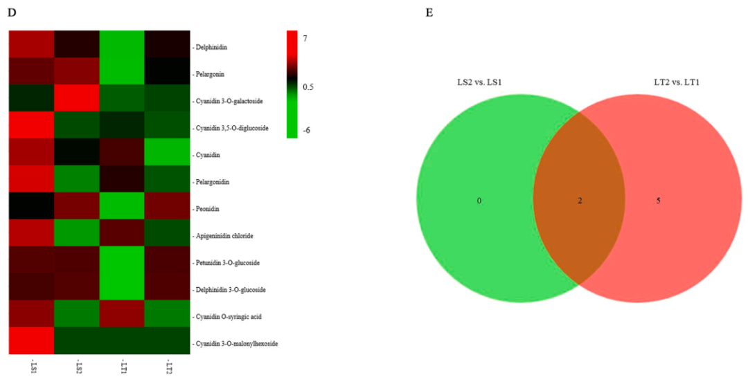 為了進(jìn)一步檢測(cè)花青素的類型,將花青素與代謝物數(shù)據(jù)庫(kù)進(jìn)行比較。其中兩種花青素,即花青素O-丁香酸和芹菜苷氯化物,在葉芽中表現(xiàn)出較高的含量,其他花青素在葉片發(fā)育期間保持在穩(wěn)定水平(圖4D)。從“Tailihong”的葉片中鑒定出11種花青素。其中三種花青素,即芹菜苷氯化物、花青素和花青素O-丁香酸隨著成熟過(guò)程而減少。相反,四種花青素,即飛燕草素3-O-葡萄糖苷、天竺葵素、牡丹素和矮牽牛素3-O-葡萄糖苷,隨著葉片發(fā)育而增加(圖4D)。多重比較表明,氰基鄰丁香酸和芹菜素氯化物在兩個(gè)紫葉品種的葉芽著色中起著關(guān)鍵作用(圖4E)