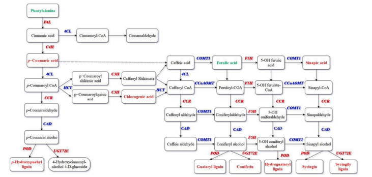 Fig.7 健康和油斑病損傷檸檬皮的木質(zhì)素合成途徑