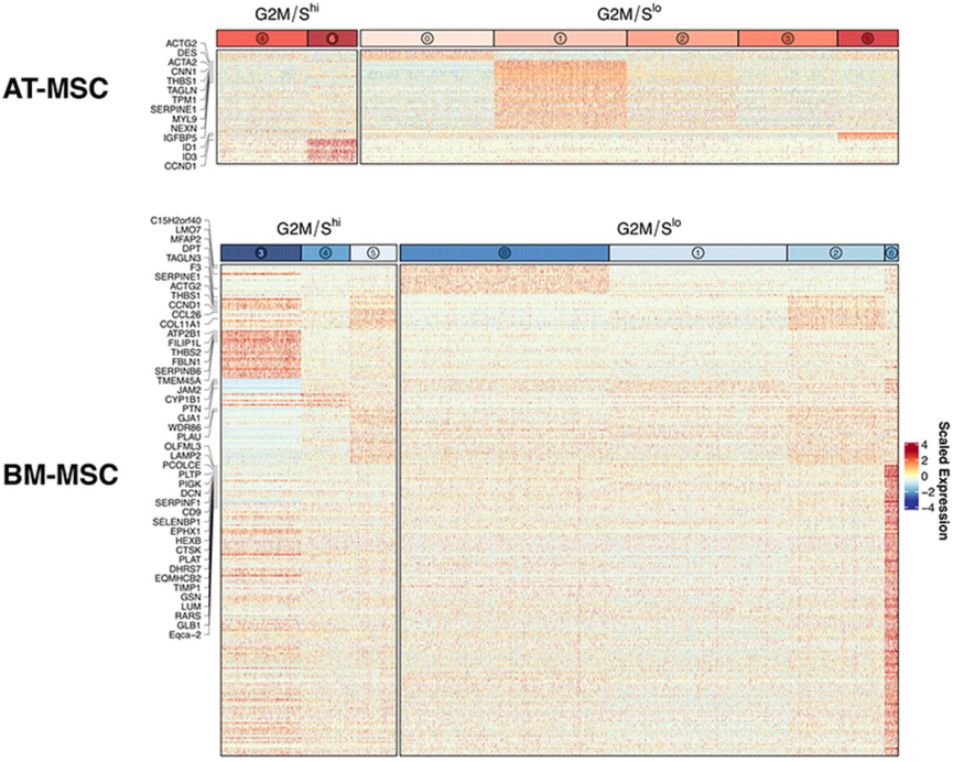 無監(jiān)督聚類分別將AT來源的MSCs、BM來源的MSCs和PBM來源的MSCs聚類為7,7,10個clusters(Fig.?4a)。根據(jù)作者最初的分析中,細胞周期相關基因的表達對聚類有很大的影響(Kowalczyk?et?al.,?2015)。在本研究中作者也觀察到一些明顯由與增殖一致的基因表達模式定義的簇(Fig.?4b),因此,作者進一步分析了G1?clusters和G2M/S?clusters,以確定不同細胞周期分類的簇間差異基因表達模式。在這種分組策略下,差異基因表達測試顯示來自AT、BM和PB衍生的MSCs中存在明顯的源內轉錄異質性,盡管在AT來源的MSCs中差異較小,差異表達基因?(DEGs)?以熱圖的形式進行展示?(Fig.?5)。為了檢查檢測到的clusters的假定生物學功能,作者對每個組織中的每個cluster進行了GO功能富集分析,其中BM來源的MSCs中排名最靠前的是cluster2的細胞遷移和cluster3中的慢性炎癥反應,PB來源的MSCs中排名靠前的是cluster4的蛋白組折疊和cluster6中的趨化性調節(jié),AT來源的MSCs沒有檢測到任何顯著富集的GO?terms,表明檢測到的clusters之間的轉錄差異極小。