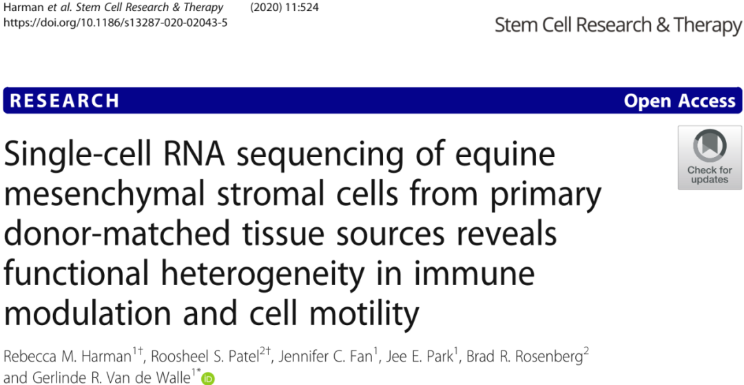 Harman?RM,?Patel?RS,?Fan?JC,?Park?JE,?Rosenberg?BR,?Van?de?Walle?GR.?Single-cell?RNA?sequencing?of?equine?mesenchymal?stromal?cells?from?primary?donor-matched?tissue?sources?reveals?functional?heterogeneity?in?immune?modulation?and?cell?motility.?Stem?Cell?Res?Ther.?2020?Dec?4;11(1):524.