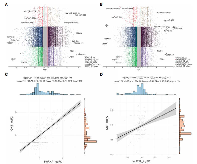 為了鑒定HT組和GD組中異常表達(dá)的lncRNA和miRNA,分別進(jìn)行了ONT全長轉(zhuǎn)錄組測序和全轉(zhuǎn)錄組測序數(shù)據(jù)。差異表達(dá)分析結(jié)果顯示,共檢測到6,153?個?lncRNA?s和?741?個?miRNAs?在?HT?患者中存在差異表達(dá)(圖?1A);GD患者中檢測到5,492個lncRNAs?和?165?個?miRNAs?存在差異表達(dá)(圖?1B);相關(guān)性分析結(jié)果驗證了本研究中兩種測序方法的檢測穩(wěn)定性(圖?1C,?D)。