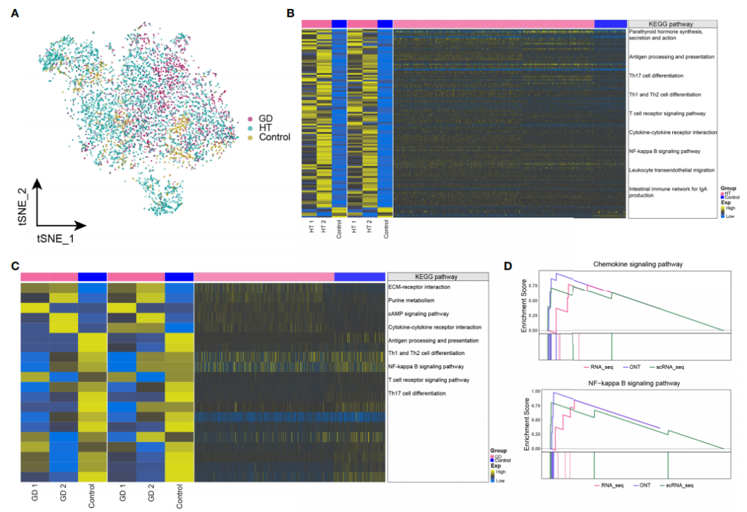 本研究基于HT患者、GD患者和健康對照甲狀腺組織的單細(xì)胞RNA測序、全轉(zhuǎn)錄組測序、ONT全長轉(zhuǎn)錄組測序和代謝組測序數(shù)據(jù),探討了HT和GD疾病微環(huán)境中基因表達(dá)失調(diào)和代謝信號異常的免疫細(xì)胞,構(gòu)建了免疫細(xì)胞的全局調(diào)節(jié)網(wǎng)絡(luò),為進(jìn)一步了解HT和GD免疫紊亂和代謝異常介導(dǎo)的疾病機(jī)制、更好地干預(yù)和治療疾病提供了科學(xué)的理論指導(dǎo)和研究基礎(chǔ)。