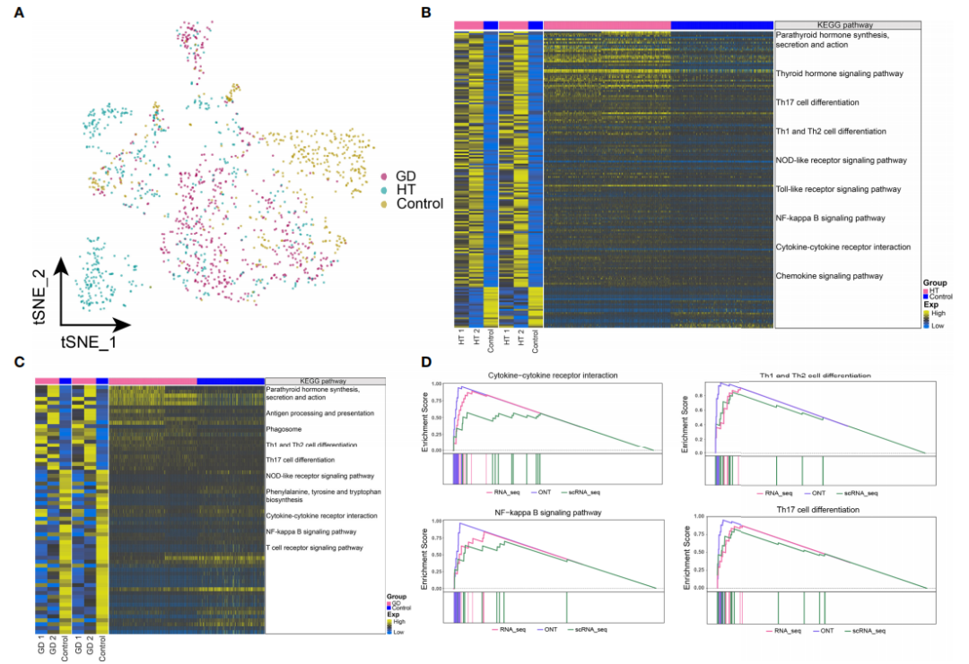 對單細(xì)胞轉(zhuǎn)錄組數(shù)據(jù)中的CD4+?T細(xì)胞亞群進(jìn)行進(jìn)一步分析,發(fā)現(xiàn)在HT、GD和對照組中細(xì)胞豐度存在明顯差異(圖?3A)。將bulk?RNA-seq數(shù)據(jù)中顯著差異表達(dá)的基因,與CD4+??T細(xì)胞的單細(xì)胞RNA-seq數(shù)據(jù)中的基因取交集,并對這些共表達(dá)的基因集進(jìn)行功能富集分析;分析結(jié)果顯示,HT組中顯著差異富集的通路有甲狀腺激素信號通路、T?細(xì)胞受體信號通路、Th1和Th2細(xì)胞分化、Th17細(xì)胞分化、細(xì)胞因子-細(xì)胞因子受體相互作用和NF-kappa?B信號通路(圖?3B);而在GD組中,甲狀旁腺激素合成,分泌和作用、ECM-受體相互作用、嘌呤代謝、cAMP?信號通路、NF-kappa?B?信號通路、細(xì)胞因子-細(xì)胞因子受體相互作用和T細(xì)胞受體信號通路顯著富集(圖?3C?)。GSEA富集分析結(jié)果顯示,HT組中細(xì)胞因子-細(xì)胞因子受體相互作用和T細(xì)胞受體信號通路顯著富集(圖?3D),但GD組中未觀察到顯著富集的通路。此外,氨基酸生物合成和嘌呤代謝相關(guān)的代謝通路在HT和GD組中均顯著富集。