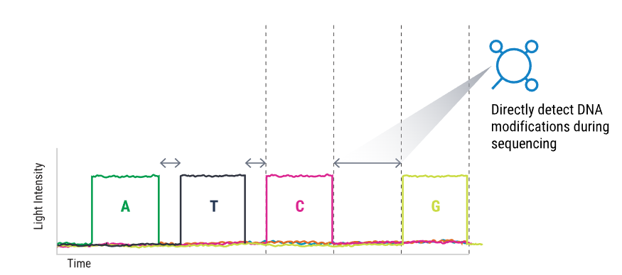 PacBio平臺主要通過DNA聚合酶與模板鏈結(jié)合,在鏈合成的過程中,不同熒光標記的堿基會釋放不同的熒光信號,根據(jù)光的波長與峰值從而判斷堿基類型與順序。聚合酶合成中每個堿基間都存在時間間隔,當(dāng)模板堿基有修飾時,兩個相鄰的脈沖峰之間的距離就會延長。當(dāng)IPD比例(兩個相鄰的脈沖峰之間的距離和參考序列距離的比值)明顯大于1 時,可推斷這個位置存在修飾。