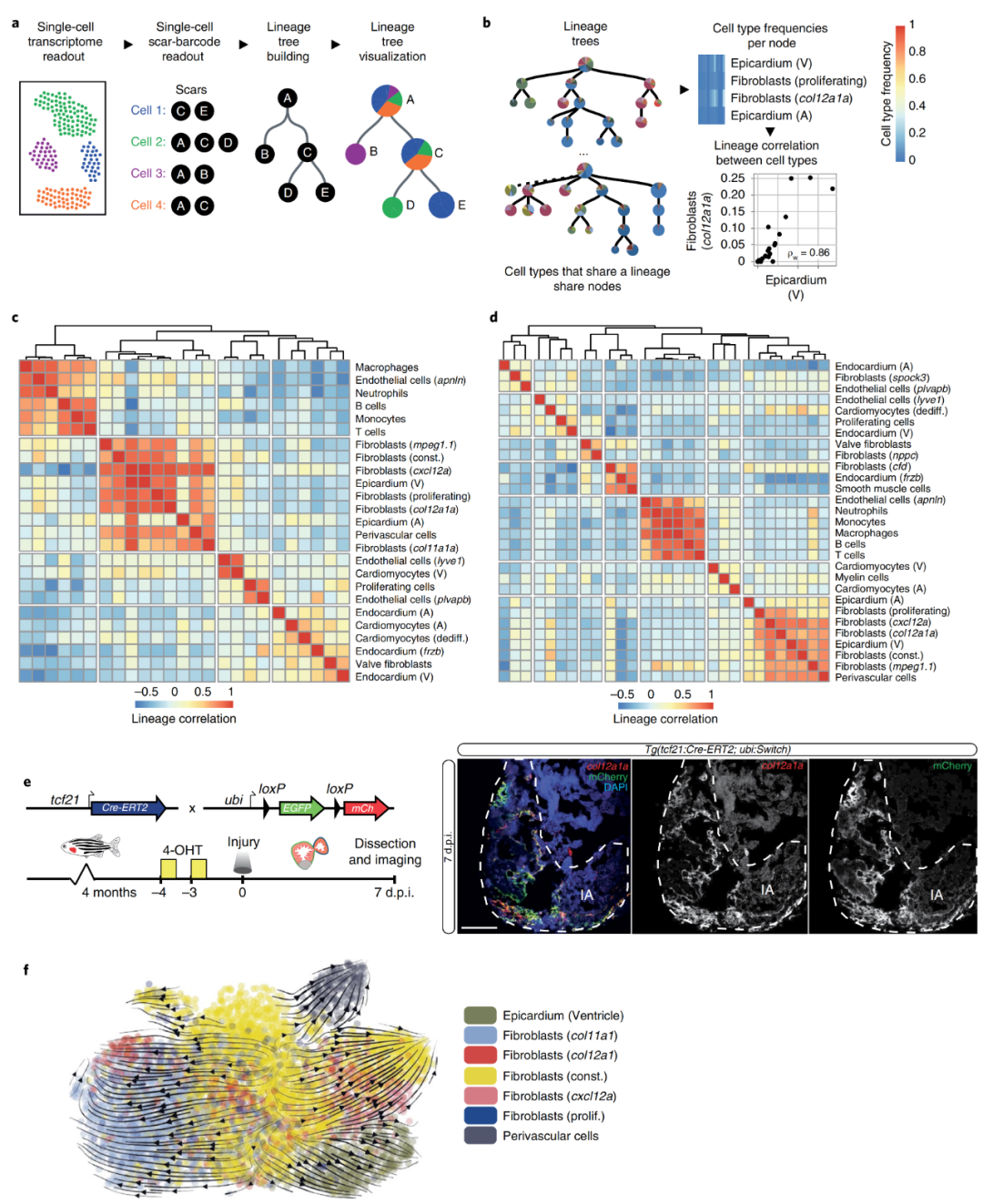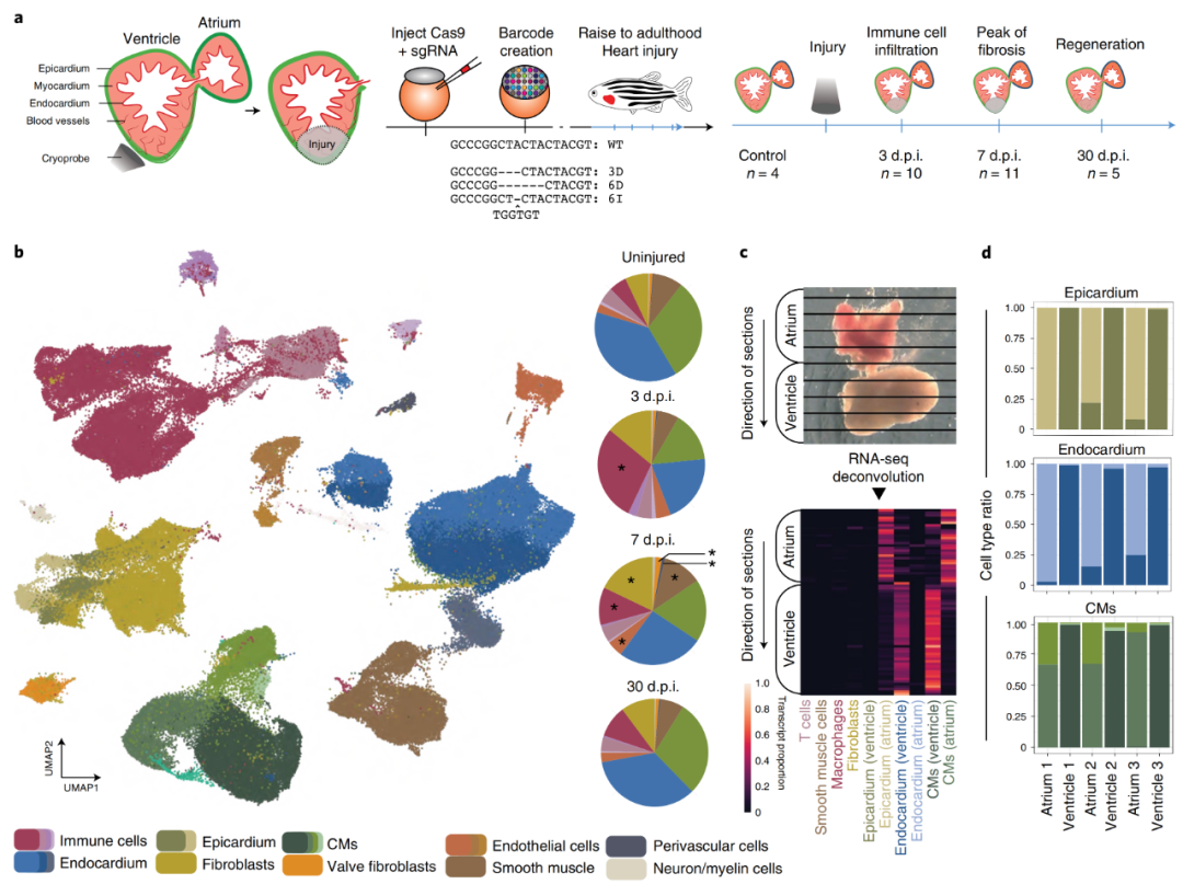 為了系統(tǒng)地識別健康和再生斑馬魚心臟中的細胞類型,作者對損傷前后不同階段的大約20萬個解離細胞進行了scRNA-seq(圖1a)。為了準確得到細胞發(fā)育起源的相關信息,作者還應用了一種基于CRISPR–Cas9技術的大規(guī)模平行譜系追蹤方法,通過注射Cas9和針對多拷貝轉基因(斑馬魚系中的dTomato:一種用于斑馬魚細胞追蹤和譜系分析的多光譜細胞標記)的sgRNA,創(chuàng)建了作為譜系條形碼的“遺傳疤痕”來記錄早期發(fā)育中的譜系關系。