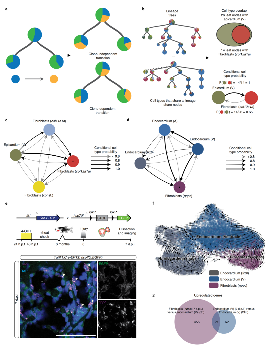 瞬時nppc成纖維細胞和其他幾個成纖維細胞亞型(spock3、cfd和瓣膜成纖維細胞)在3 d.p.i.或7 d.p.i.時不屬于心外膜譜系,但與心內膜以及彼此之間顯示中度正相關?;谙嚓P性的分析有一個潛在的假設,即所有克隆體都會表現(xiàn)出相似的轉換率(圖5a),但是這種假設并不適用于所有細胞類型,于是作者引入條件概率開發(fā)了第二種算法(圖5b)。在3 d.p.i.時,不同成纖維細胞類型:col11a1a成纖維細胞、構成型成纖維細胞、心外膜(心室)轉變?yōu)?em>col12a1a成纖維細胞類型的條件概率均大于0.9(圖5c)。在7 d.p.i. 時,不同的心內膜細胞類型:心內膜(心房)、心內膜(心室)和心內膜 ( frzb )轉變?yōu)?em>nppc成纖維細胞的條件概率均大于0.8,表明這種成纖維細胞類型與心內膜之間存在譜系關系。為了驗證算法的真實性,作者構建了轉基因系Tg(fli1:Cre-ERT2; hsp70l:Switch)。在7 d.p.i.表達的EGFP與內源性表達的nppc共定位(圖5e),證實了瞬時nppc成纖維細胞的心內膜起源。RNA速度分析揭示了心室內膜和nppc成纖維細胞之間的轉錄相似性和潛在的過渡路徑(圖5f)。從單細胞轉錄組數(shù)據(jù)中觀察到,與健康對照組心臟相比,心內膜在7 d.p.i.時發(fā)生了激活反應(圖5g)。