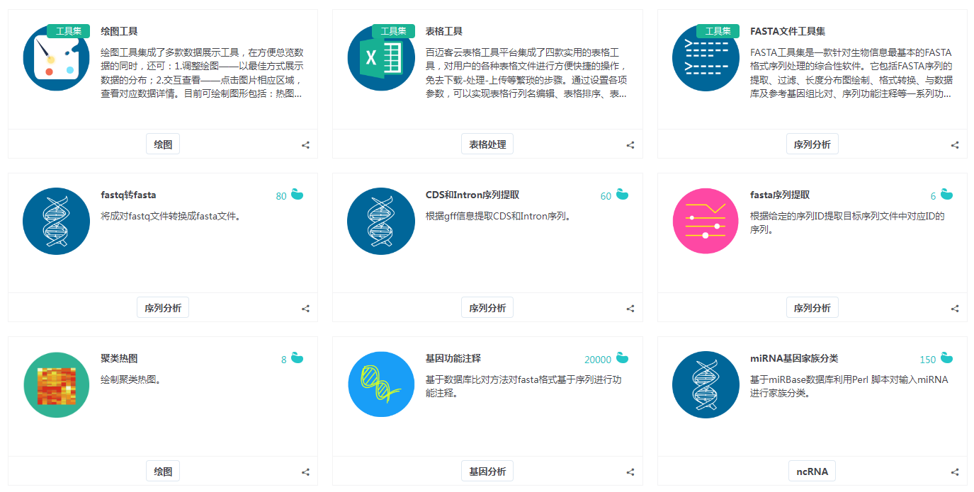 文獻(xiàn)里面好看又直觀的的美圖是如何制作出來噠?比如韋恩圖、箱形圖等。這就需要用到一些畫圖工具,這里推薦百邁客云在線分析工具,百邁客云有104款分析小工具,涵蓋基因分析、遺傳進(jìn)化、ncRNA、質(zhì)控、組裝、比對(duì)、數(shù)據(jù)提取、突變、統(tǒng)計(jì)、表格處理、繪圖、序列分析等12大功能,非常齊全。