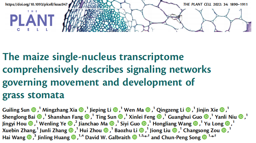 Sun G, Xia M, Li J, et al. The maize single-nucleus transcriptome comprehensively describes signaling networks governing movement and development of grass stomata. Plant Cell. 2022 Apr 26;34(5):1890-1911.