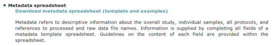 可以看見我們上傳數(shù)據(jù)需要準(zhǔn)備三個(gè)文件,分別為:Metadata spreadsheet、Processed data files、Raw data files。下面分別介紹每個(gè)文件如何填寫以及準(zhǔn)備。