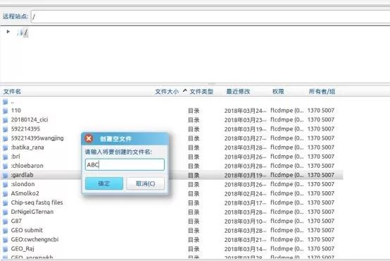 連接成功后,在遠(yuǎn)程站點(diǎn)下的文件名展示中創(chuàng)建自己的文件,在fasp目錄下面創(chuàng)建自己的目錄(當(dāng)然也可以與fasp目錄同級(jí)下創(chuàng)建),例如ABC,創(chuàng)建方法為點(diǎn)擊鼠標(biāo)右鍵,會(huì)出現(xiàn)下圖中的創(chuàng)建空文件夾對(duì)話框,輸入自己文件夾的命名,之后點(diǎn)擊確認(rèn),這樣你的文件夾就創(chuàng)建成功了。