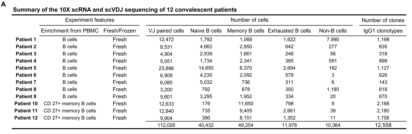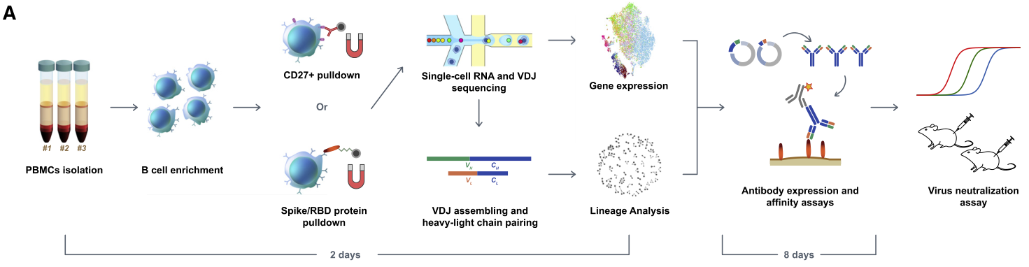 樣本設(shè)計(jì):從12個(gè)COVID-19康復(fù)患者的外周血單核細(xì)胞PBMC中分離B細(xì)胞,對(duì)B細(xì)胞和CD27+記憶B細(xì)胞進(jìn)行scRNA-seq + scBCR-seq,獲得IgG1亞型抗體,并進(jìn)行抗體體外檢測(cè)和篩選。