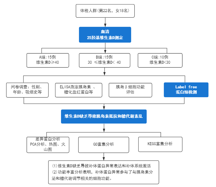 在該研究中,作者應(yīng)用高通量非靶向蛋白質(zhì)組學(xué)技術(shù),根據(jù)維生素D水平,對(duì)不同空腹血糖狀態(tài)下的體檢人群進(jìn)行分組,探討維生素D缺乏對(duì)人體補(bǔ)體系統(tǒng)激活的可能機(jī)制。為蛋白質(zhì)組學(xué)在疾病研究中的應(yīng)用提供了一個(gè)很好的案例。