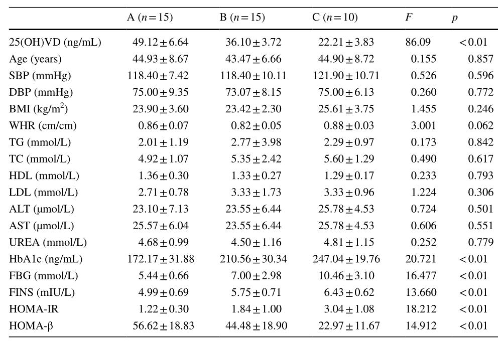 表1顯示了三組人體樣本的一般信息。比較了三組的一般數(shù)據(jù),發(fā)現(xiàn)三組之間在年齡、SBP、DBP、BMI、WHR、TC、TG、HDL、LDL、ALT、AST和尿素方面沒(méi)有顯著差異(p>0.05)。隨著維生素D含量的降低,HbA1c、Fbg、FINS和HOMA-IR水平升高,而HOMA-β水平則相反。這些結(jié)果表明,維生素D缺乏導(dǎo)致血糖水平升高和胰島素抵抗。