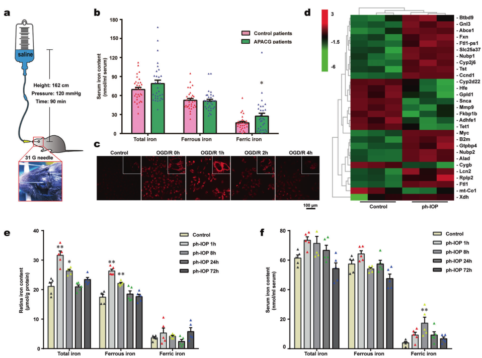 1. 通過分析急性原發(fā)性閉角型青光眼(APACG,Ph-IOP損傷最典型的一類青光眼)患者外周血清鐵離子含量發(fā)現(xiàn),青光眼患者血清中三價鐵離子含量較正常人群升高,推測鐵代謝可能參與調(diào)控了ph-IOP條件下RGC的損傷過程;