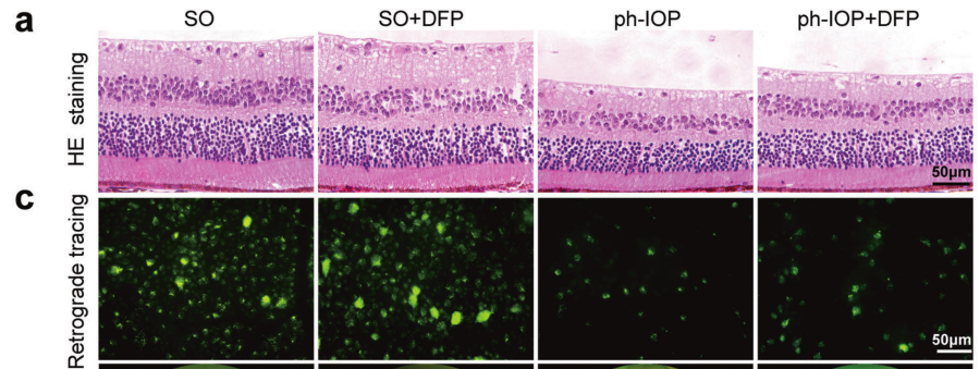 H&E染色結(jié)果顯示,Ph-IOP損傷導致顯著的RGC丟失和視功能損害;接著從形態(tài)學和功能上驗證了DFP對RGC的藥理作用,在 ph-IOP 損傷后5天,DFP處理減弱了神經(jīng)節(jié)細胞復合體(GCC)厚度,并增加了RGC數(shù)量(FG標記RGC形態(tài))。這些結(jié)果表明,DFP在ph-IOP損傷后保護 RGC 損傷,因此使用DFP抑制鐵死亡是治療ph-IOP誘導的RGC 損失的有效治療策略。