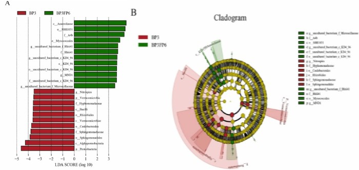 LDA值分布柱狀圖(上),LEfSe分析進化分枝圖(下)