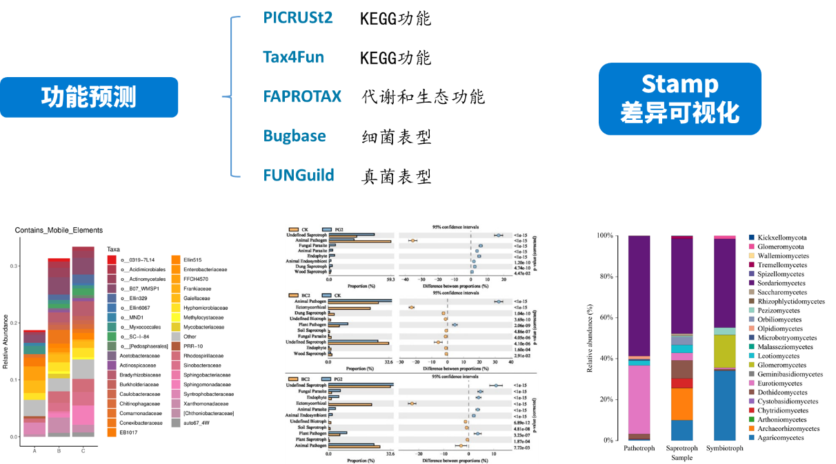 PICRUSt 2 將特征序列(16S rRNA)與微生物基因組數(shù)據庫(IMG,Integrated Microbial Genomes)參考序列對齊(aliign)構建進化樹,找到特征序列的“最近物種”,并根據已知物種的基因種類和豐度信息預測未知物種的基因信息,從而結合基因的KEGG通路信息預測整個群落的通路情況。通過組間差異分析,得到在組間具有顯著差異的功能,最后利用Stamp對結果進行差異可視化。