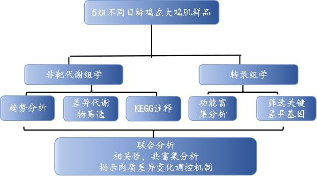雞胸肉含有不飽和脂肪酸和較低的脂肪、鈉和膽固醇,是大家最喜歡肉類(lèi)之一。近年來(lái),隨著人們對(duì)食品營(yíng)養(yǎng)價(jià)值和自身健康的重視,研究者們開(kāi)始致力于如何提高肉類(lèi)質(zhì)量的研究,而生長(zhǎng)時(shí)期是影響雞肉質(zhì)量的重要因素,但不同時(shí)期哪些特定代謝物積累是影響雞肉品質(zhì)的關(guān)鍵還不清楚。本研究使用代謝組和轉(zhuǎn)錄組技術(shù),確定了特定代謝物積累的關(guān)鍵基因,有助于了解肉類(lèi)質(zhì)量發(fā)展下的生物過(guò)程,并探索特定代謝物積累的有價(jià)值的生物標(biāo)志物。