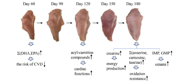 隨著日齡的增長(zhǎng),十五烷酸、硬脂酸、肌酸、肌肽、IMP、L-組氨酸和賴(lài)亮氨酸呈上升趨勢(shì),而鵝氨酸、DHA、天冬氨酸、LPA 18:1和 LPI 18:1隨著日齡的增長(zhǎng)而下降。