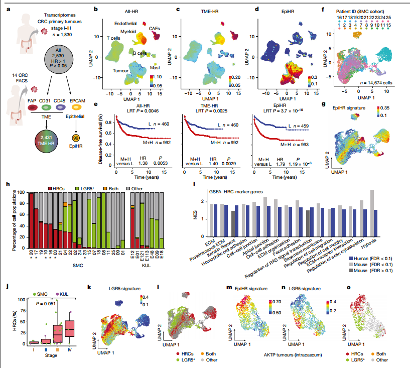 該團(tuán)隊(duì)通過(guò)單細(xì)胞轉(zhuǎn)錄組測(cè)序(scRNA-seq)手段,首先對(duì)CRC患者樣本進(jìn)行數(shù)據(jù)分析,發(fā)現(xiàn)大多數(shù)不良預(yù)后基因是由一群獨(dú)特的腫瘤細(xì)胞(包括:CAFs、內(nèi)皮細(xì)胞以及較小程度上髓系細(xì)胞)表達(dá)的,該團(tuán)隊(duì)將其命名為高復(fù)發(fā)細(xì)胞(high-relapsecells,HRCs)。