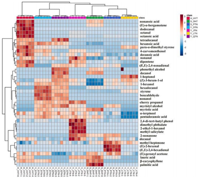 7個(gè)產(chǎn)區(qū)突尼斯軟籽石榴揮發(fā)性化合物的熱圖:風(fēng)味譜、糖、有機(jī)酸和維生素c含量存在顯著差異。所有石榴花粒中共鑒定出40種揮發(fā)性化合物,其中醇、醛、酸和二戊烯是影響石榴香氣品質(zhì)主要因素。