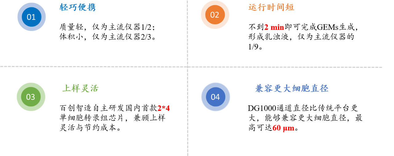 百創(chuàng)DG1000突破直徑壁壘:為了突破單細胞試劑耗材及儀器長期以來的國外技術壟斷,降低單細胞應用的成本,突破主流平臺40μm細胞直徑限制,滿足更多的單細胞場景需求。經(jīng)過潛心研發(fā),百邁客發(fā)布了自主研發(fā)的單細胞微液滴系統(tǒng)-百創(chuàng)DG1000。