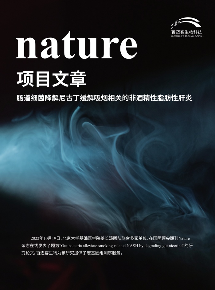 2022年10月19日,北京大學(xué)醫(yī)學(xué)部姜長濤團(tuán)隊聯(lián)合美國國立衛(wèi)生研究院、浙江大學(xué)醫(yī)學(xué)院、復(fù)旦大學(xué)基礎(chǔ)醫(yī)學(xué)院和溫州醫(yī)科大學(xué)的研究團(tuán)隊在國際期刊《Nature》發(fā)表了題為“Gut bacteria alleviate smoking-related NASH by degrading gut nicotine”的重磅研究。該研究解析了腸道尼古丁積累在非酒精性脂肪性肝炎進(jìn)展中的作用,發(fā)現(xiàn)了人類腸道中一種能夠代謝尼古丁的內(nèi)源性細(xì)菌,并提出了一種可能的減少吸煙加劇NAFLD進(jìn)展的途徑。百邁客為該研究提供了宏基因組測序服務(wù)。點擊了解詳情:Nature-宏基因組聯(lián)合多組學(xué)研究揭示腸道有益菌對非酒精性脂肪性肝炎的保護(hù)作用